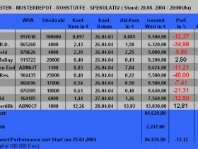 Unseren Musterdepots haben die letzten zwei Wochen auch gut getan - es zeigt sich, dass die Erholung der Minenkurse sehr schnell gehen kann, wenn erst mal die Rohstoffnotierungen anziehen. Jubilee Mines hat diese Woche gute Gewinnzahlen vorgelegt und eine saftige Dividende für September angekündigt, womit dieser Titel annähernd 10% Dividendenrendite erreicht! Bei BHP Billiton wurde auch Dividende bezahlt - 220 Euro können wir damit mit diesem Titel bis jetzt gutschreiben. Entsprechend dem freundlichen Umfeld entwickelten sich auch die Kurse der anderen Titel positiv.