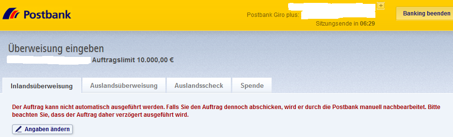 Und NEIN, das Limit ist selbst mit anderen Überweisungen des Tages nicht erreicht.