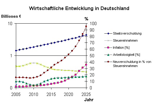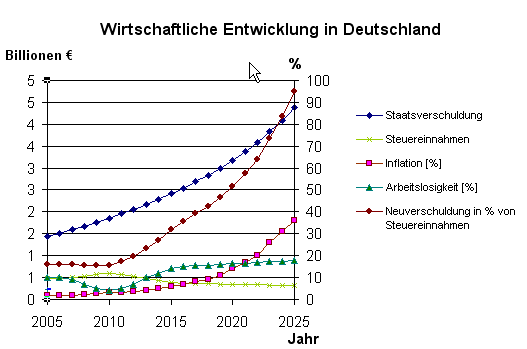 Ich möchte einmal dazu aufrufen, dass Ihr Eure Szenarien für die Wirtschaftentwicklung der nächsten zwanzig Jahre skizziert. Am besten wäre es Diagramme anzuhängen, in denen Staasverschuldung (!)Inflation, Zinssatz, Steuereinnahmen, Arbeitslosigkeit etc. dargestellt sind.
