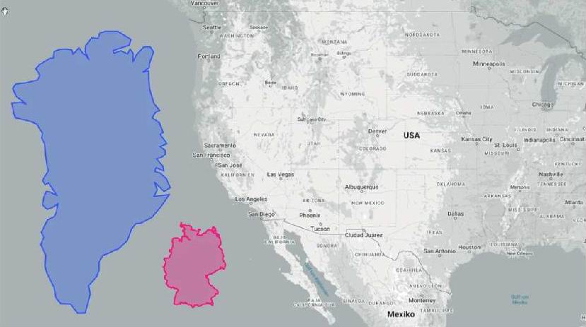 Der Größenvergleich hinkt stark, bedingt durch die Merkatorprojektion, bei der Flächen einer Kugel in 2-dimensionaler Darstellung stark verzerrt werden. Umso weiter es in Richtung der Polen geht, desto stärker ist die Verzerrung, d.h., das weit nördlich liegende Grönland wird stark vergößert dargestellt.