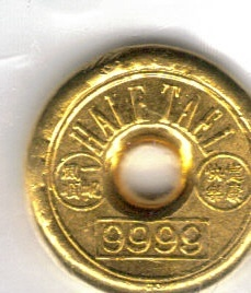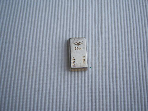also: degussa-sargähnlich gefertig. nummeriert mit "42345" und 9999 gepunzt. zusätzlich "degussa-raute" mit "AS" gekennzeichnet und gewicht 25 gr.