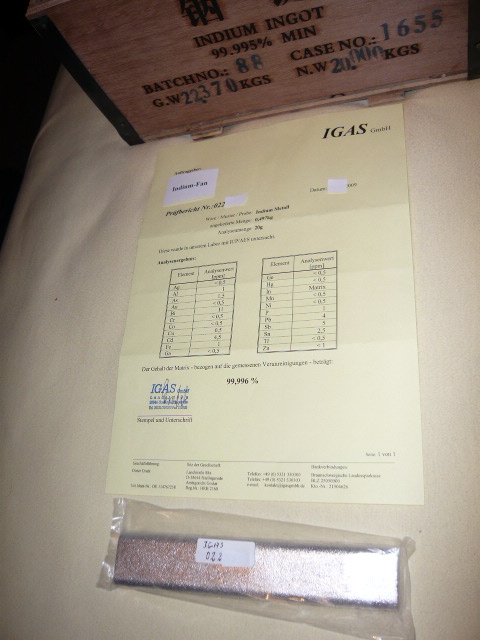Bild 1 zeigt einen Indiumbarren nach der Analyse durch das Prüflabor IGAS in Goslar. Die analytische Methode nennt sich ICP/AES. Dazu wurde ein Barren eingeschmolzen. Von der homogenisierten Schmelze werden 20 Gramm für die Analyse entnommen. Der Rest der Indiumschmelze wird in die komische Form, die man am unteren Bildrand sieht zurückgegossen. Der Prüfbericht soll auf Bild 1 absichtlich nur soweit zu erkennen sein, dass keiner damit Missbrauch betreibt.