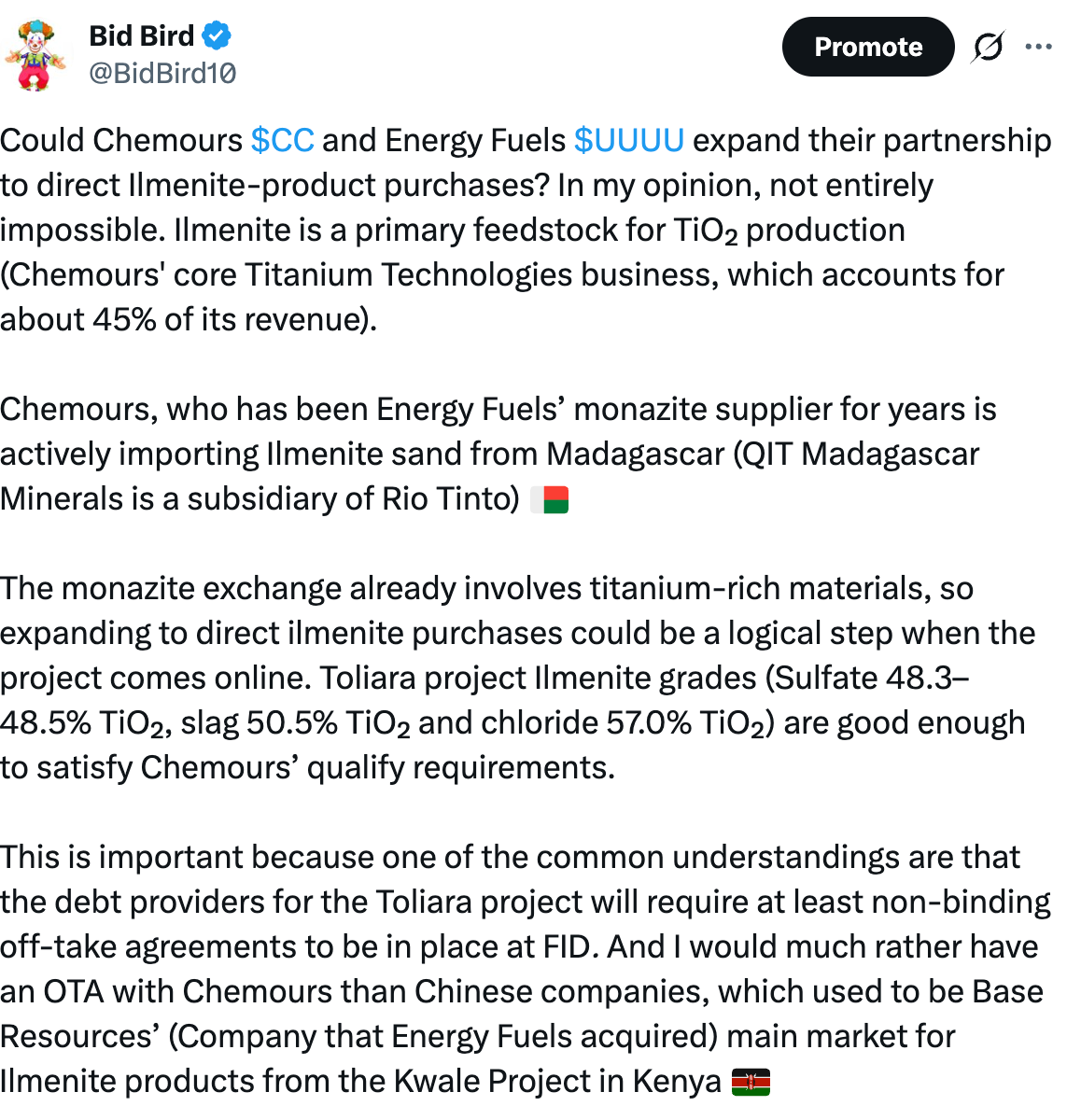 Ein möglicher westlicher Abnehmer für die Ilmenitprodukte aus Toliara ist Chemours, das bereits mit Energy Fuels zusammenarbeitet. Chemours ist ein Spin-off des großen US-amerikanischen Chemieunternehmens Dupont de Nemours. Chemours importiert aktiv Ilmenitsand aus dem Projekt von Rio Tinto in Madagaskar.