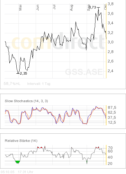 Jetzt der 1,5 Jahres-Chart. Der Anfang 2004 gestartete Abwärtstrend wurde im Frühjahr mit dem 70%-Anstieg verlassen. Seitdem steigt auch die 50-Tages-Linie wieder.