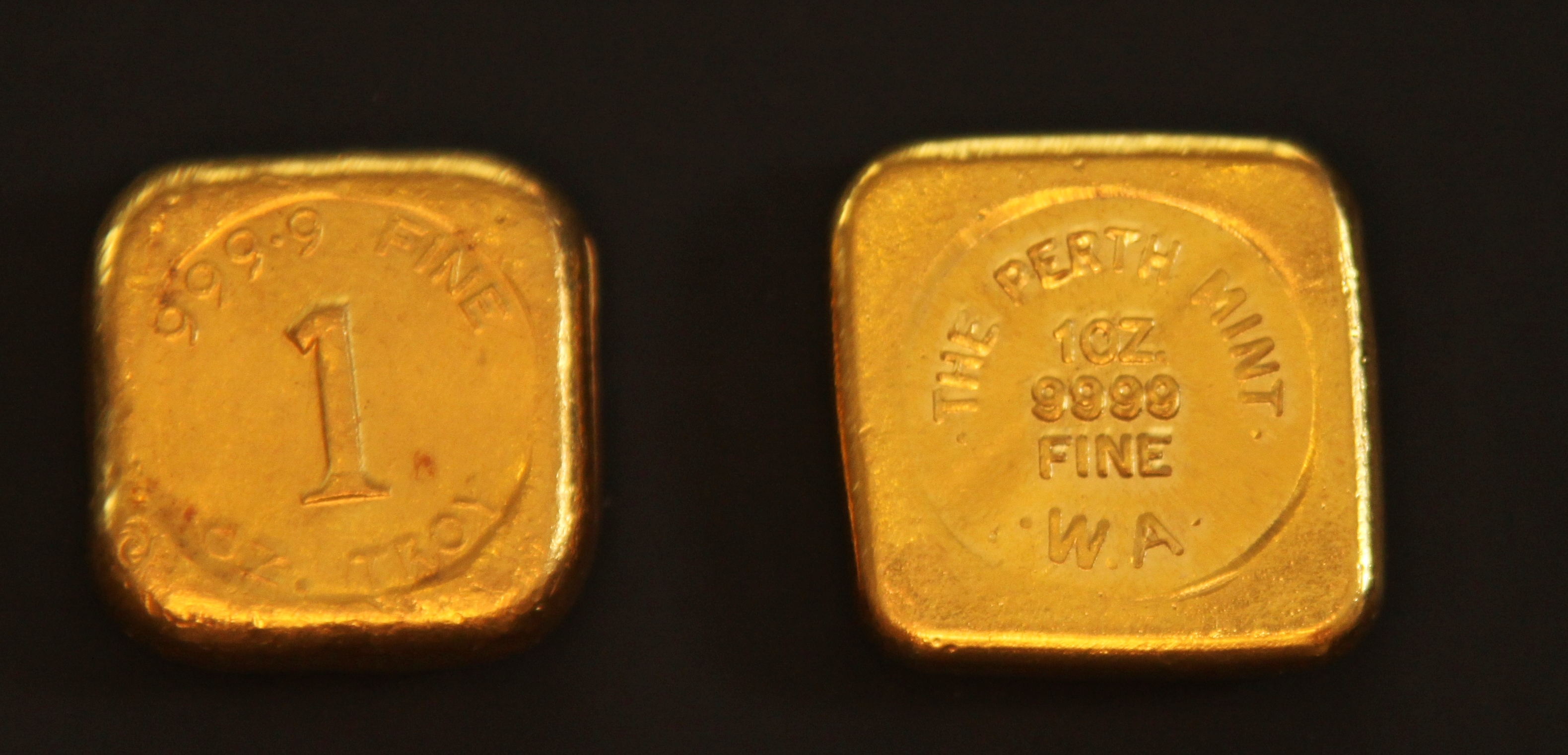 Jeweils links in den Fotos seht Ihr Vorder- und Rückseite einer Goldunze von DEAK INTERNATIONAL AUSTRALIA.