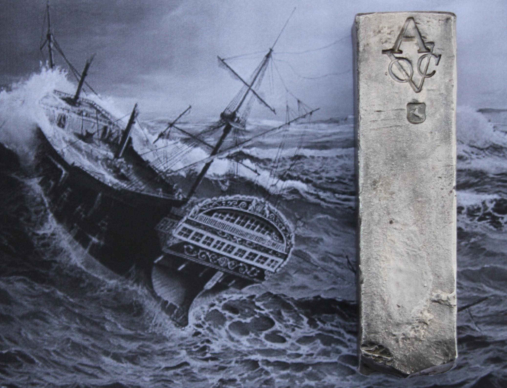 Und so bin ich nun Besitzer eines 1.962 g schweren und etwa 15 cm X 4 cm X 3 cm großen Silberbarrens von der Rooswijk. Er trägt das bekannte „VOC“-Zeichen mit dem „A“ für Amsterdam sowie ein schönes Wappen mit einem springenden Bock. Dieses ist erst jüngst von einem Experten als Prüfstempel von Otto Buck oder Wouter Buck identifiziert worden.