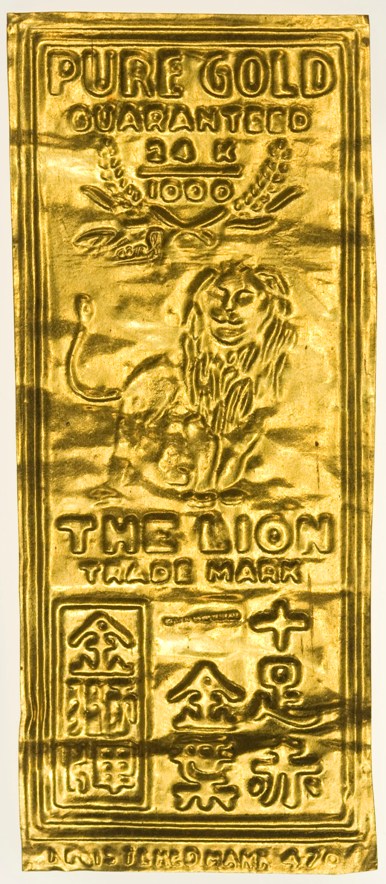 für die Anhänger des Exotischen - hier ein Foto meines jüngsten Zugangs: ein Goldstreifen "THE LION" mit den Abmessungen ca. 88 mm X ca. 36 mm, dünn wie ein Blatt Papier und mit einem Gewicht von 5,8 Gramm, also 1/2 Tola.