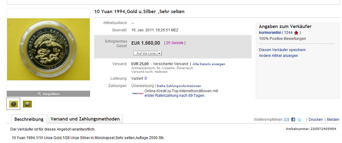 Der Verkäufer hätte wahrscheinlich noch einen Tausender rausholen können, wenn besser beschrieben und internationaler (Paypal für USA, Kanada & Australien) angeboten hätte.Auch Einhorn 5 Unzen 1995 (inoffizielle Auflage von 503 Stück) ist "günstig" weggegangen, obwohl für 5 Unzen sicherlich teuer genug. CTG hat sicherlich seine Freude damit.