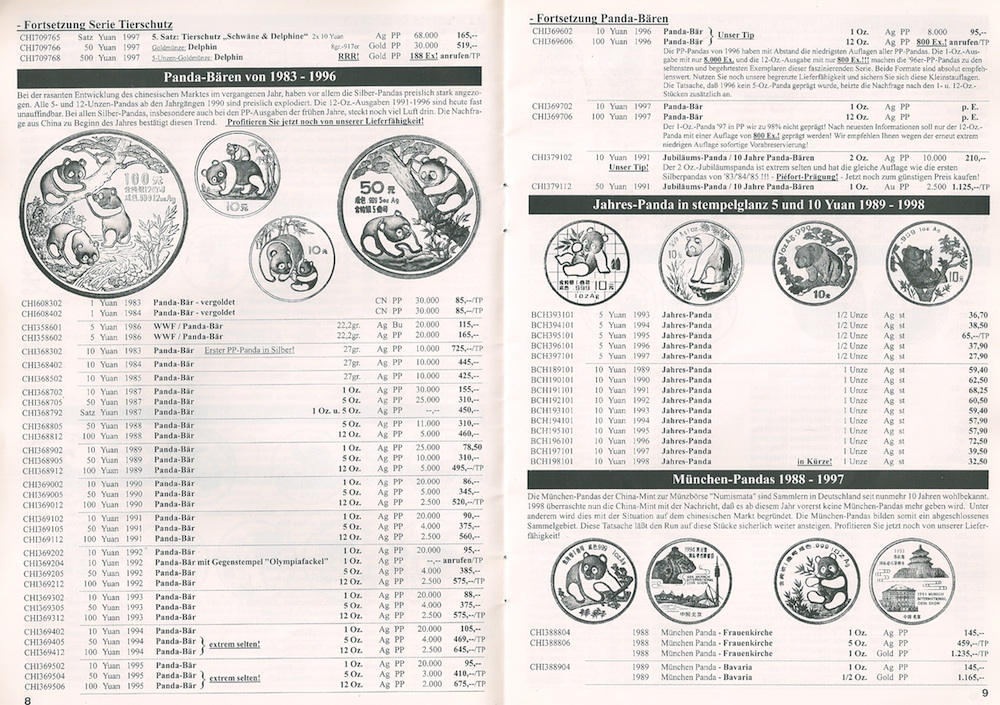 Anbei die versprochenen Preise zu den Panda Silberlingen aus einem Katalog aus dem Jahre 1998. Preise sind in DM.