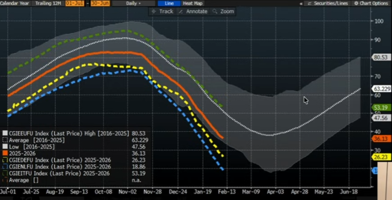 - Sommer-Ausblick: Unabhängig davon, wie wir durch diesen Winter kommen – die Wiederbefüllung der Speicher ab April 2026 wird bei einem Startwert von vielleicht nur 10 % sehr teuer und langwierig werden. Dies wird die Gaspreise im Sommer 2026 hoch halten.