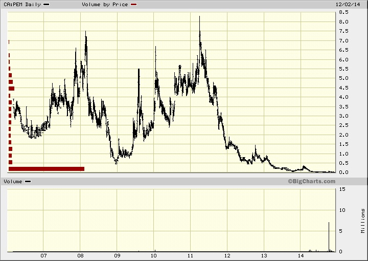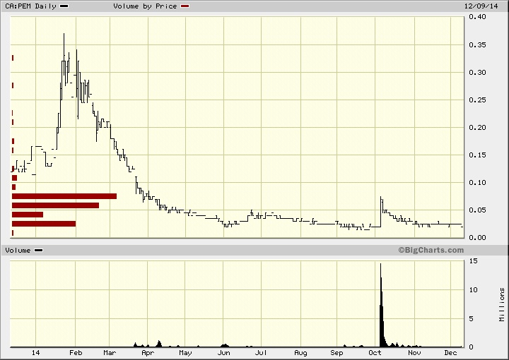 Unmittelbar NACH den Drilling Ergebnissen hier unten, am 06.10.2014, ist irgend jemand mit für so einen zerbeutelten Wert hohem Kapitalfluss (mindestens ca. eine Million Ca$) eingestiegen, das Volumen sieht man sogar im Langzeitchart noch als größten Spike gut (s.u.). Seither ist sie aber wieder zurück gekommen auf 0,02 Ca $.
