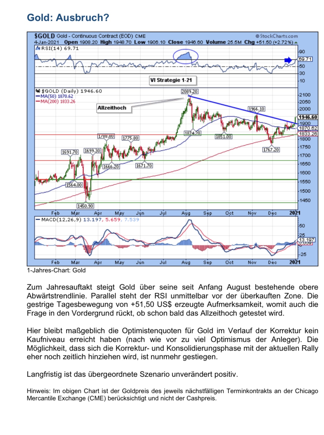Für ihn ist die Korrektur erst vorbei, wenn Gold das Novemberhoch 1966$ überwunden hat. (siehe Anhang)