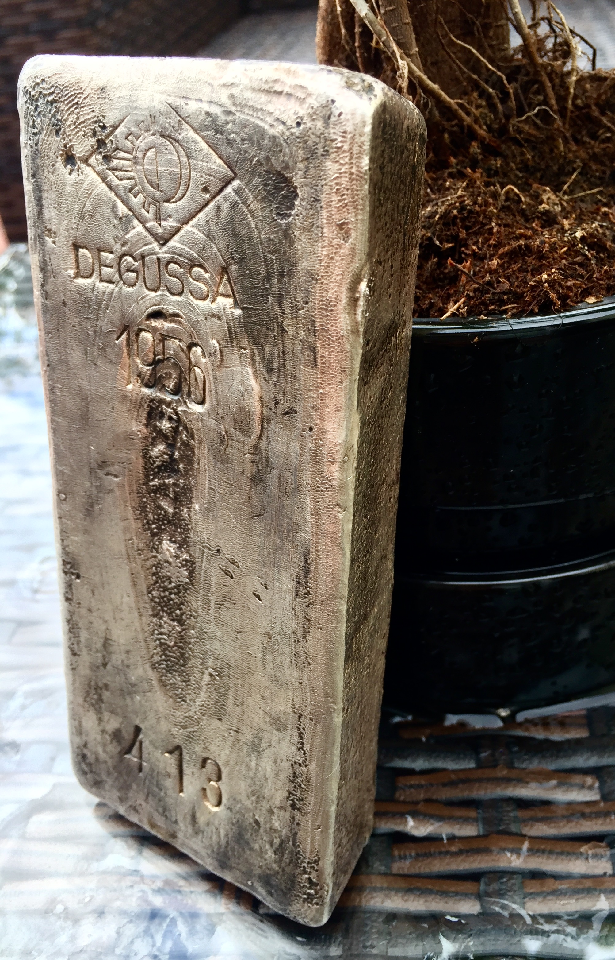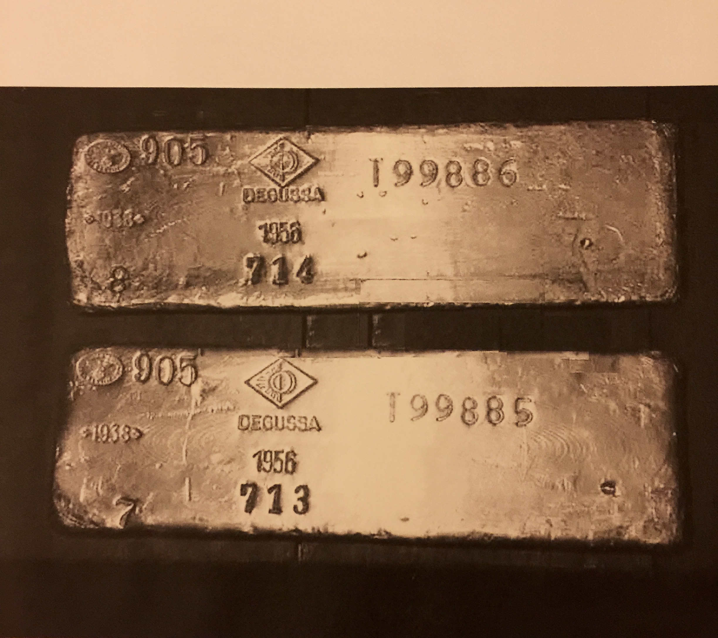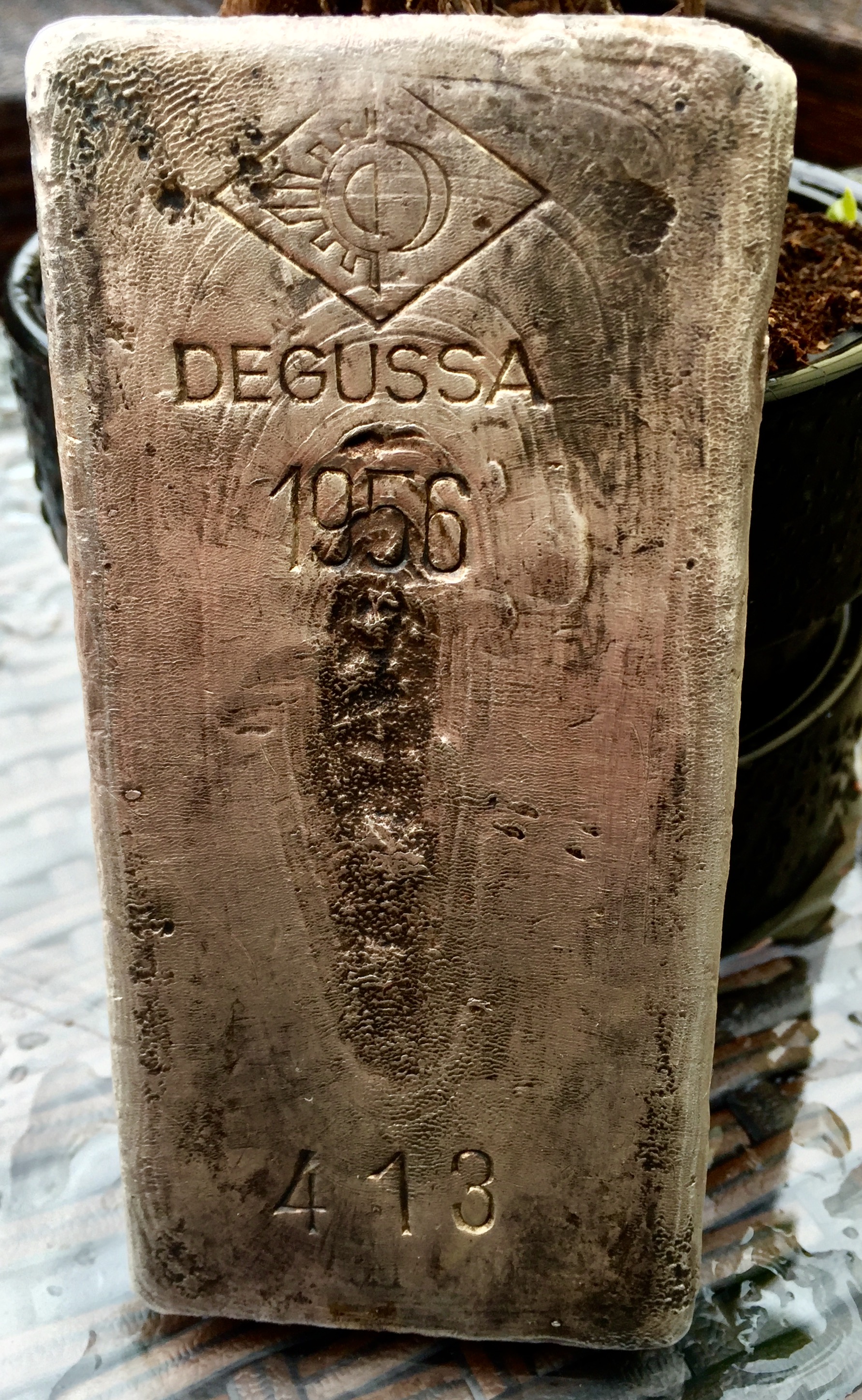 Zur genauen Identifizierung möchte ich dieses Stück gern von der alten Degussa (jetzt Umicore Group) untersuchen lassen.Das letzte Foto zeigt eines der größeren Stücke vor der Umschmelze. Dort ist auch das Datum 1956 mit der neuen Seriennummer erfasst. Diese neuen Nummern wurden dann auch auf den umgeschmolzenen Barren verwendet.