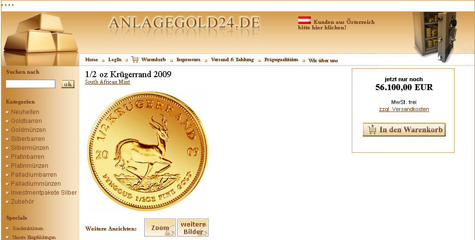 Ich habe dort am 15.01.10 einige 1/10-Unzen Krügerrand bestellt - die Abwicklung erfolgte absolut problemlos. Soweit ich mich erinnern kann, schnelle Lieferung und gute Verpackung. Die Versandkosten betrugen 6 Euro.