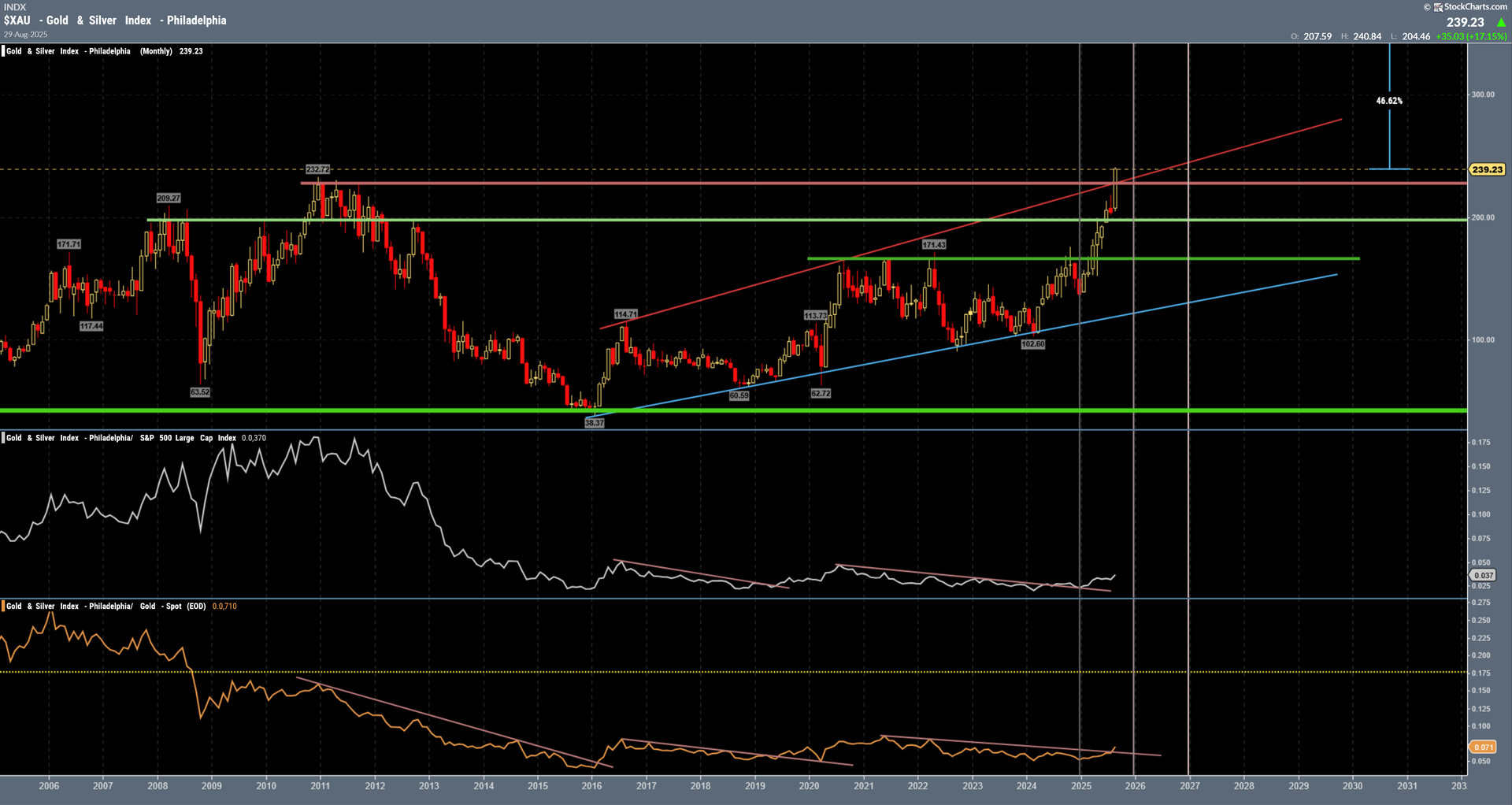Das sieht doch schon mal sehr stark aus. Viele Tage bis September sind es nicht mehr und ein close über 229-230 würde neues Kaufsignal generieren. Auch die Minen gegenüber Gold und S&P sind ausgebrochen. Es sieht einfach gut aus!! Noch sind wir nicht nachhaltig über dem Berg.