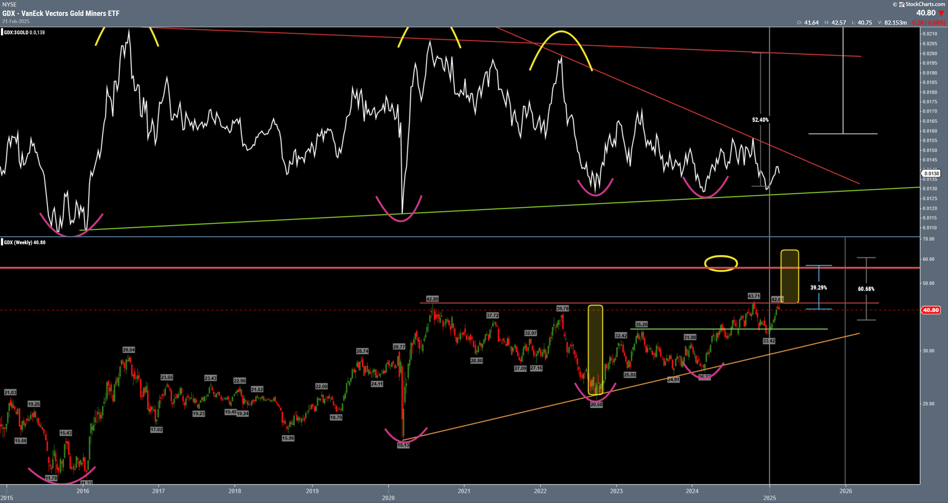 Der schöne GDX Chart ist noch im LOT...aber der Ausbruch war relativ schwach und mühselig, was ein Warnsignal war.