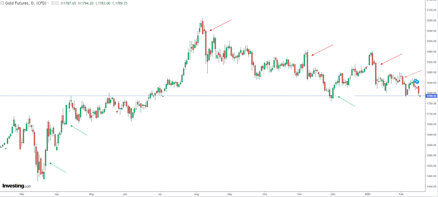 Dennoch: Schaut man sich den Goldchart - ich hoffe, ich kann ihn einstellen - an, sieht man u.a. im Daily diese Kerzen (rot oder grün markiert). Der SL ergibt sich demzufolge oberhalb (bei einer roten) bzw. unterhalb (bei einer grünen) dieser langen Kerze.