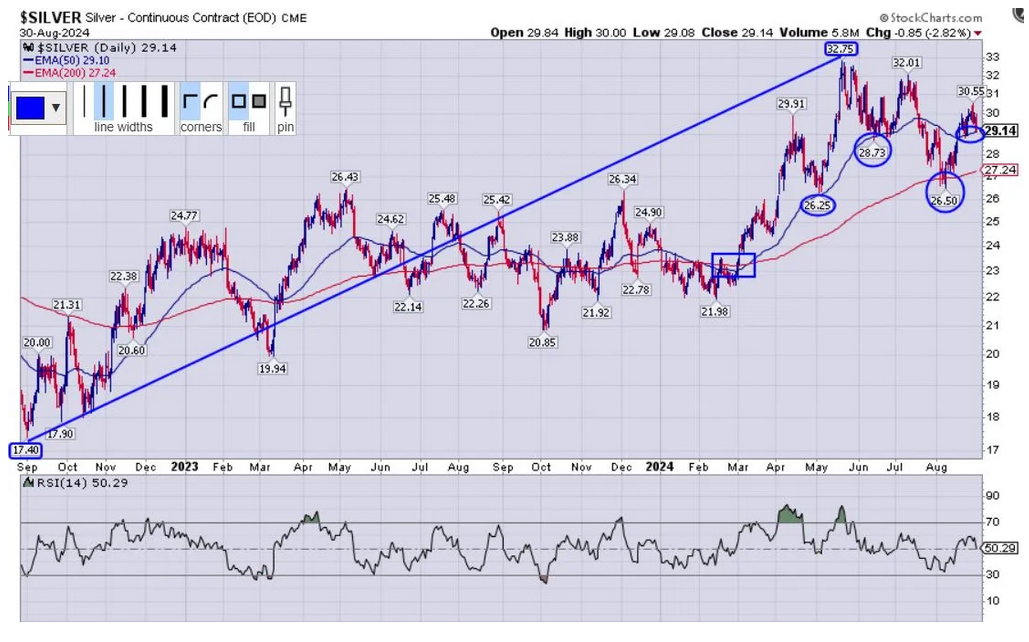 Hier ist ein 2-Jahres-Tageschart der Silber-Futures, das den 88%igen Preisanstieg vom Zwischentief im September 2022 bei $17,40 bis zum jüngsten Höchststand im Mai 2024 bei $32,75 zeigt. Wie bereits in früheren Rohstoff-Updates besprochen, können wir sagen, dass sich Silber trotz seines chaotischen Chartbildes in den letzten Jahren im Allgemeinen in einem Aufwärtstrend befand und die prozentuale Entwicklung des Goldpreises im selben Zeitraum sogar übertraf. Silber hält sich immer noch am oberen Ende des Preisspektrums auf.