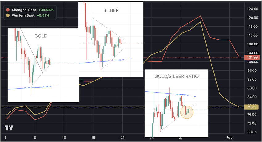Vor dem Hintergrund unterschiedlicher Preise in Ost und West, hat sich auch an "unserer" Situation für Gold, Silber und deren Ratio wenig bis fast nichts verändert -