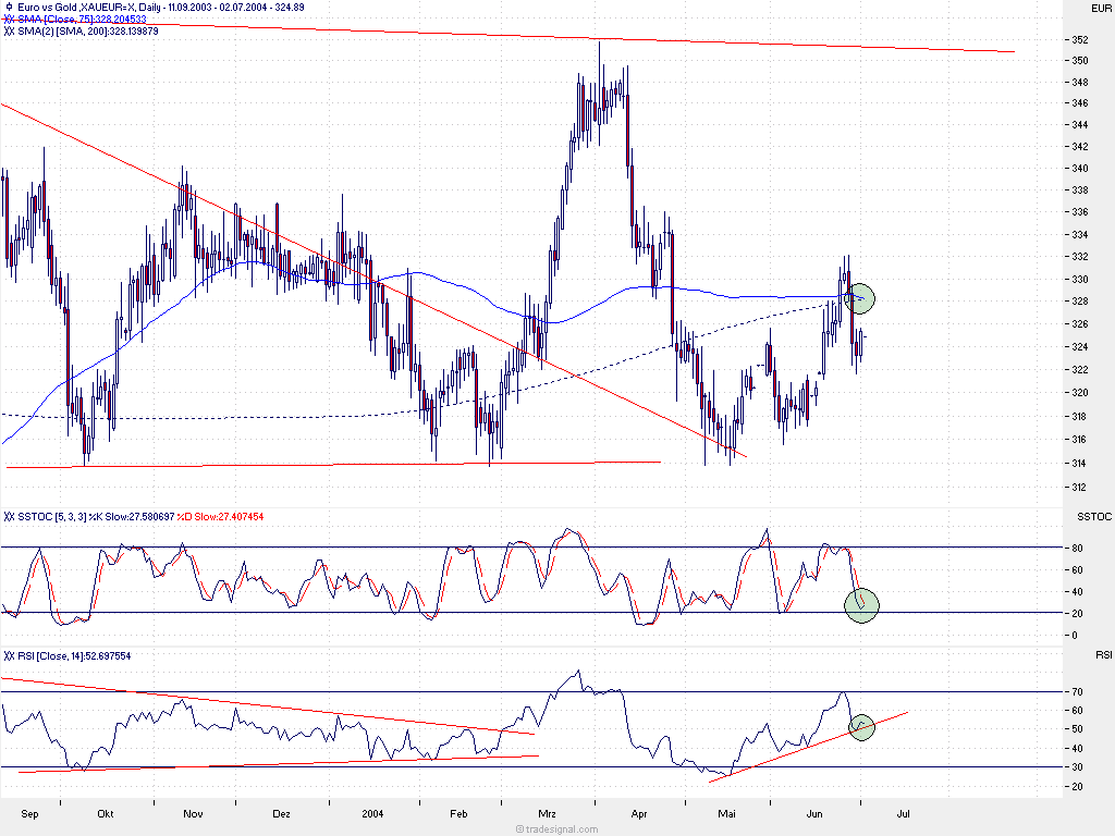 Wieder nur ein kurz ein Update des Charts, welches die zuvor getätigten Aussichten schön visuell darstellt. Nun könnte sich Gold (in EUR) für die nächste Zeit um die oberste rote Linie tummeln, solange der SSTOC noch nach unten "schaut".