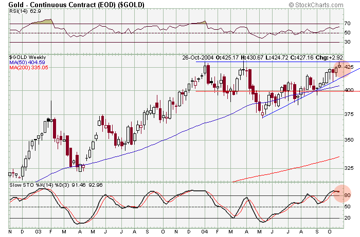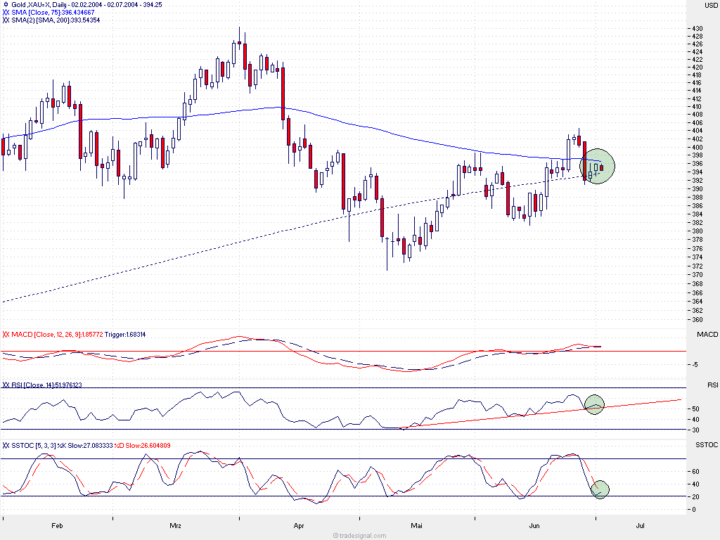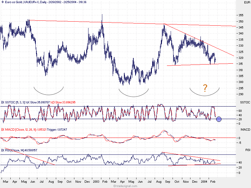 Auch im Wochenchart (gold-weekly.png) zeigt sich ein Dreieck, aus dem der Kurs ausbrechen könnte - sowohl nach oben, als auch nach unten. Letzeres scheint in Anbetracht der Tatsache, daß der Stochastik-Indikator sowohl im Wochen- als auch im Tageschart überkauft ist, für wahrscheinlicher . Der Stochastik im Monatschart steht derzeit auf steigende Kurse (aber der Monat ist ja noch nicht zu Ende).
