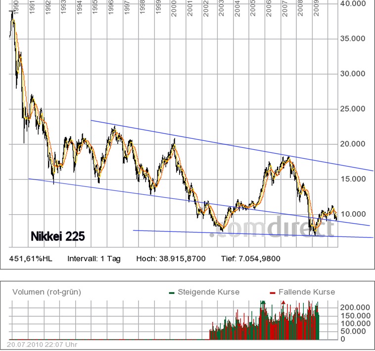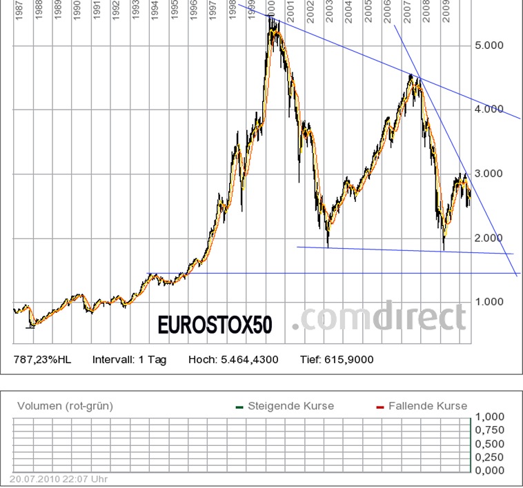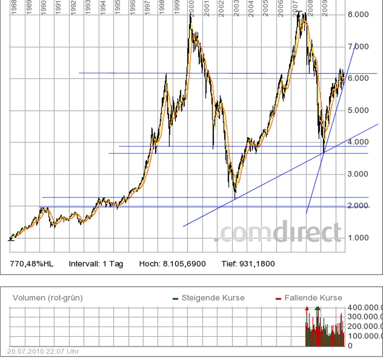 -> nach unten ist Platz bis zum unteren Trendkanal, bis zum Tief von 2009 oder sogar noch tiefer bis 2.x00 Punkte